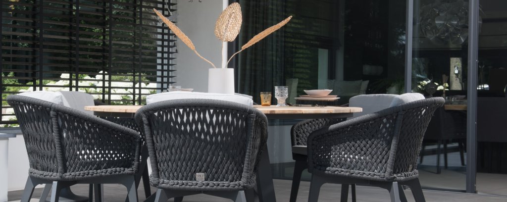 Het aluminium frame garandeert een lange zorgeloze levensduur. De afwerking met robuuste aluminium poten in combinatie met de antraciet gekleurde rope draad en de antraciet en licht grijs gekleurde kussens zorgen voor een harmonieuze rustieke sfeer die perfect in iedere tuin tot zijn recht komt.