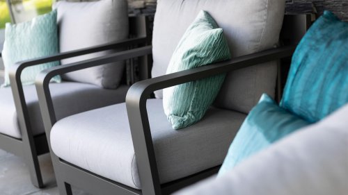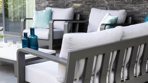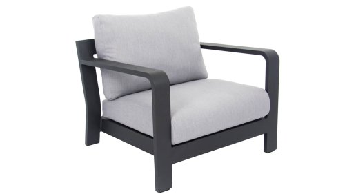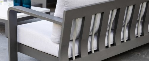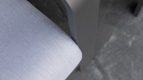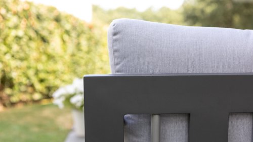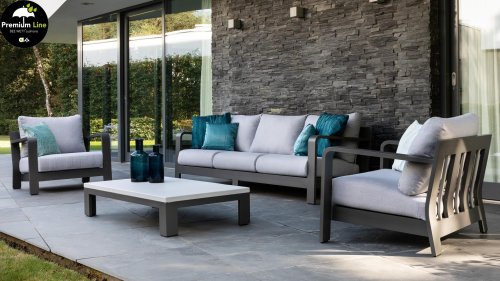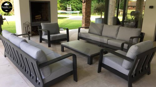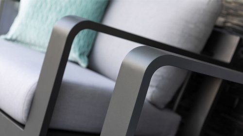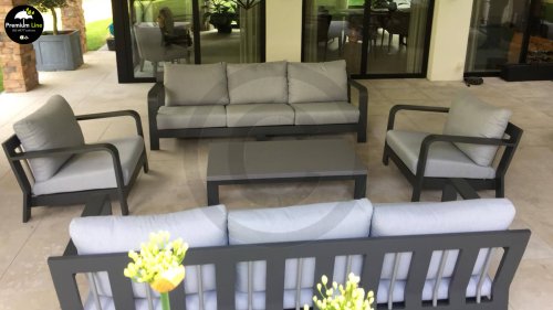 Dit prachtige loungeset is kenmerkend door zijn prachtige rondingen! Het frame is gemaakt van hoogwaardig aluminium en dubbel laags gepoedercoat in matt antraciet. De combinatie met de lichte kussens en aluminium buizen in het achterframe geven deze lounge zijn prachtige karakteristieke sfeer! De salontafel is voorzien van een duurzame LWC top met een prachte light grey finish. De combinatie van kleuren en materialen zorgt voor het originele en jonge karakter van deze moderne loungeset.