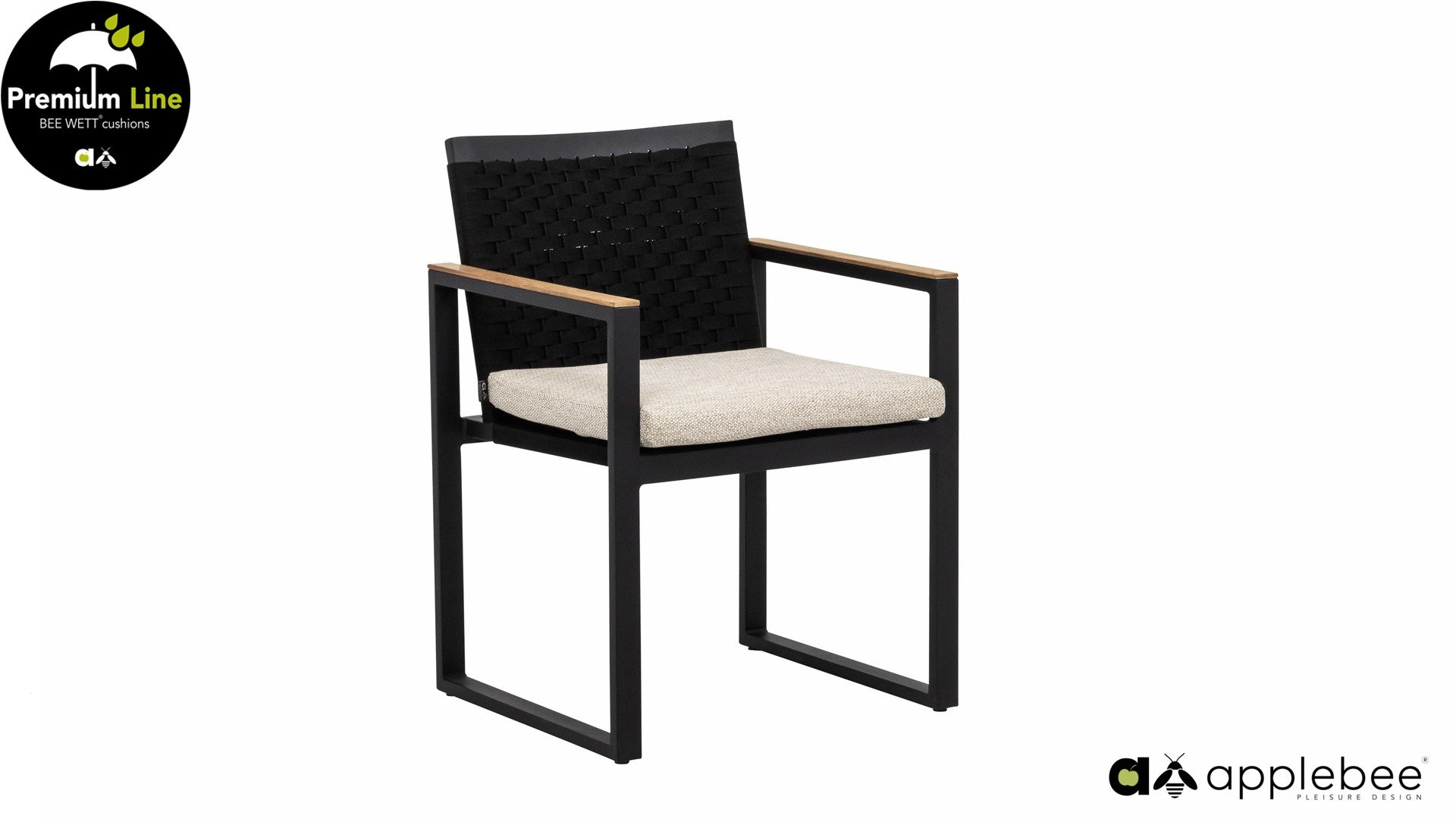 De Applebee Dominica dining stoel is gemaakt van matzwart gepoedercoat aluminium. Het frame is in de rugleuning en zitting voorzien van een solide zwartkleurige belt. Het lichte zitkussen en het teakhouten detail in de armleuning zorgen voor contrast en levendigheid. Voor deze tuinset is gekozen voor een combinatie met de eettafels waarin diezelfde materialenmix van matzwart aluminium en naturel teakhout terugkomt. Het voordeel van de Applebee Condor tafel is dat de poten naar binnen geplaatst zijn, daardoor kan ook aan de kop van de tafel een extra zitplaats gecreëerd worden.