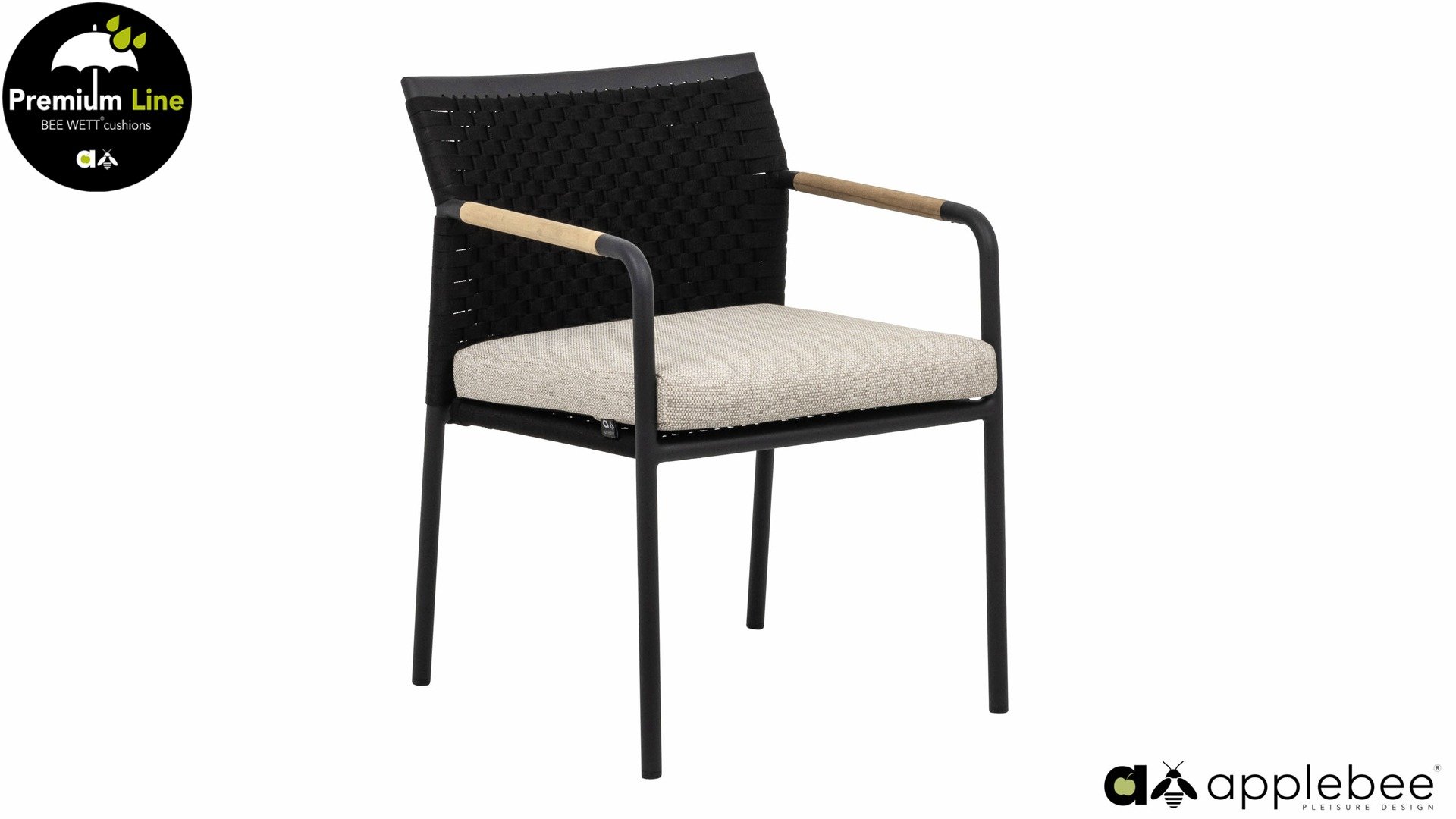 Het basismateriaal van de Elle Rope tuinset is matzwart gepoedercoat aluminium. De BEE WETT® kussens hebben een grove weefstructuur, maar dit wel met een soft touch voor het optimale comfort. Samen met de mooie rondingen in de rug en het gebruik van naturel teakhout in het tafelblad en de stoelleuningen, krijgt de Applebee Elle Dining toch dat aangename vleugje natuurlijke warmte mee.