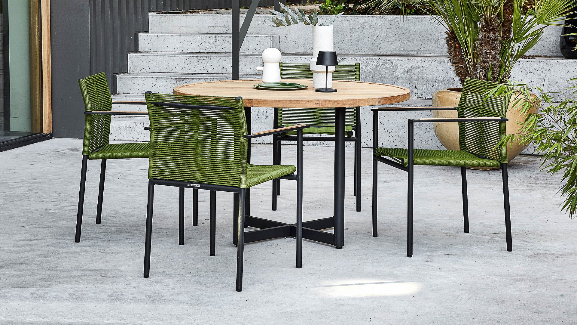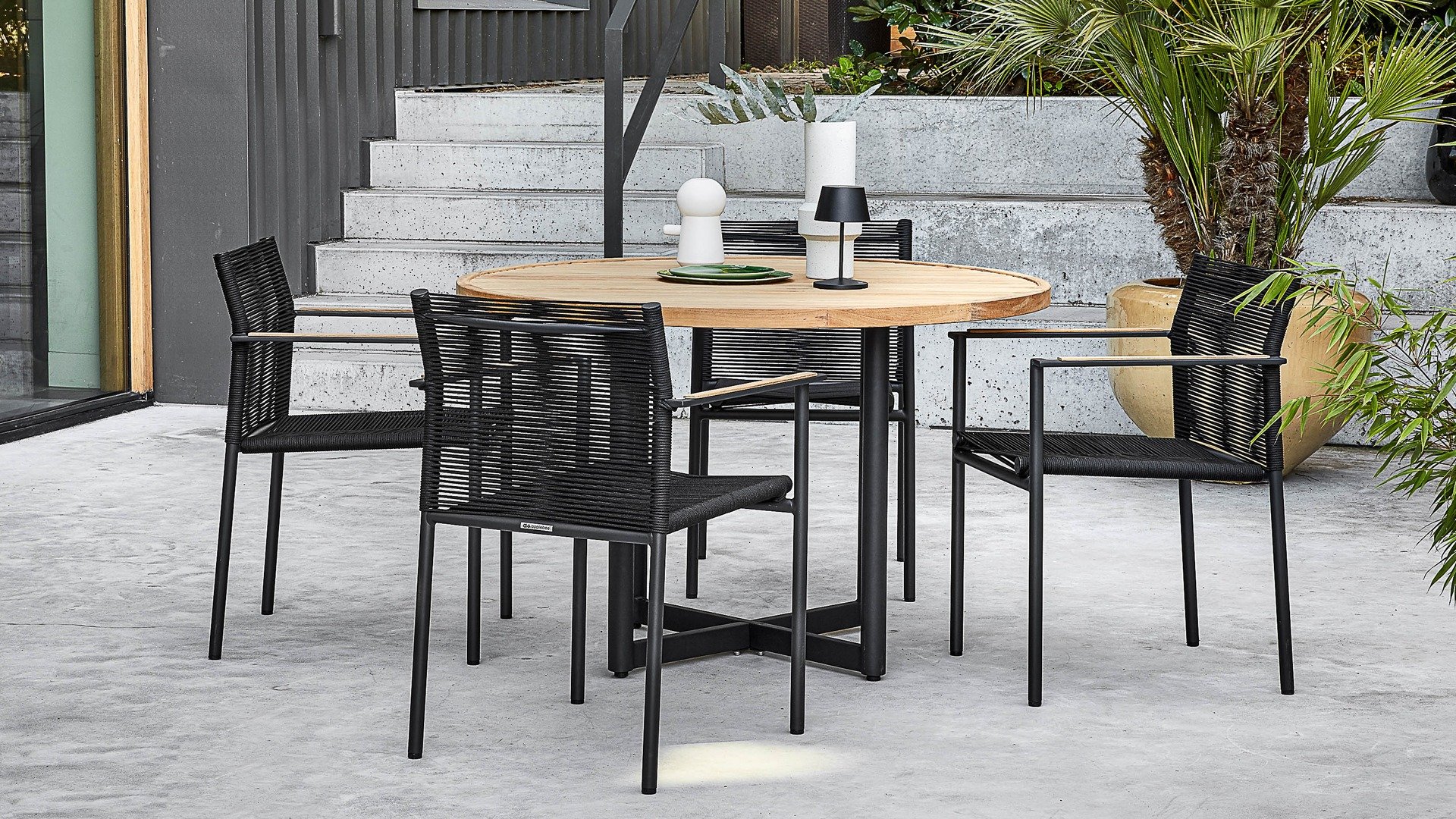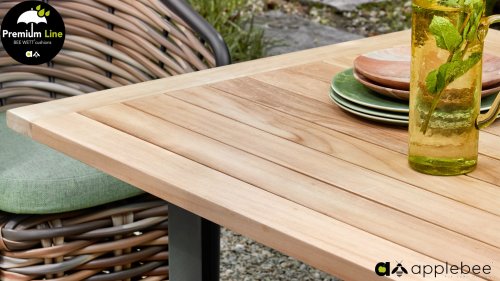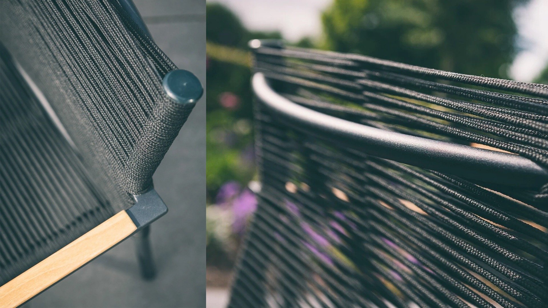 De Jakarta dining van AppleBee is werkelijk een feest voor de ogen! De prachtige frames zijn gemaakt van aluminium hebben een zwarte coating. In dit frame is een prachtig rope gevlochten met een zachte en comfortabele uitstraling. De prachtige vormen houden dit moderne design helemaal in balans. Deze prachtig afgewerkte tuinset van AppleBee heeft een minimalistisch ontwerp met mooie details. Het zwarte frame zorgt in combinatie met het rope en vergrijsde teakhout voor een moderne stijl met een naturel Touch.