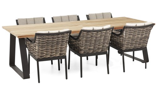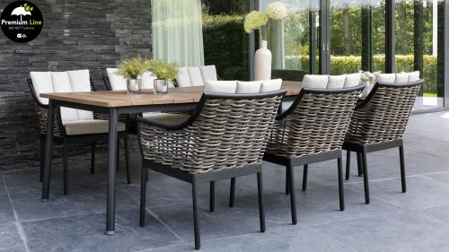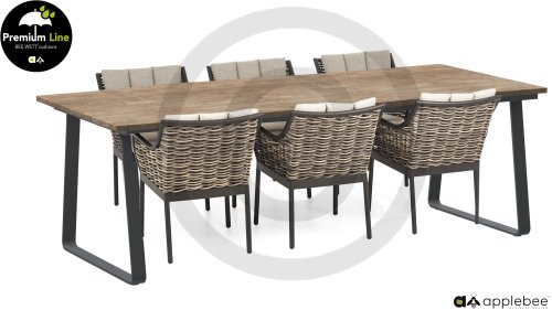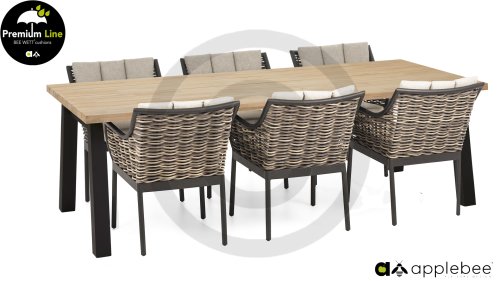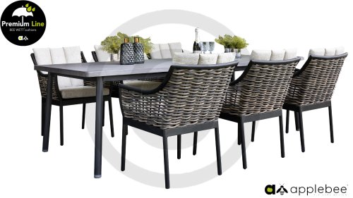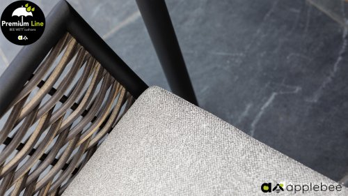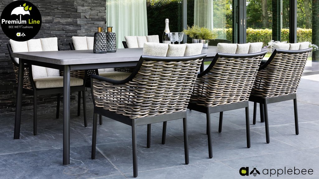 Bij de premium line zijn de kussens voorzien van Bee Wett® technologie, wat ervoor zorgt dat de kussens weer snel droog zijn na een fikse regenbui. Je kunt de kussens dus gewoon buiten laten liggen. De drainage aan de onderzijde van het kussen zorgt er namelijk voor dat het water de kussens eenvoudig kan verlaten. Het extreem dikke vlechtdraad vergt een bijzondere vlechttechniek, die alleen de beste vlechters beheersen. Deze ambachtslieden vlechten iedere draad één voor één handmatig in. Je haalt met AppleBee Milou tuinset dus een echt staaltje ambachtskunst in huis. Prachtige combinatie met een teakhouten tafel of de moderne tafel met LWC top!