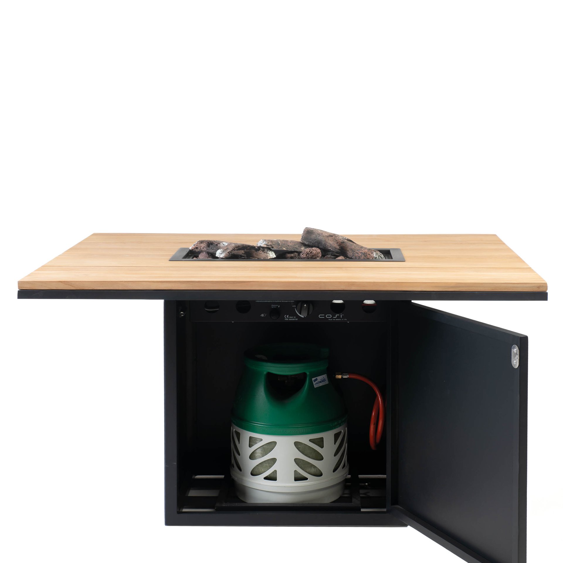De top is verkrijgbaar in de kleuren: Grey, Natural teakhout of Black teak. Natural teak zal na verloop van tijd vergrijzen. De Cosi Loft wordt compleet geleverd met gasdrukregelaar, houtblokken, lavastenen en beschermhoes. Ook word de topplaat er los bijgeleverd zodat na gebruik de haard kan worden afgesloten en er één grote salontafel ontstaat.