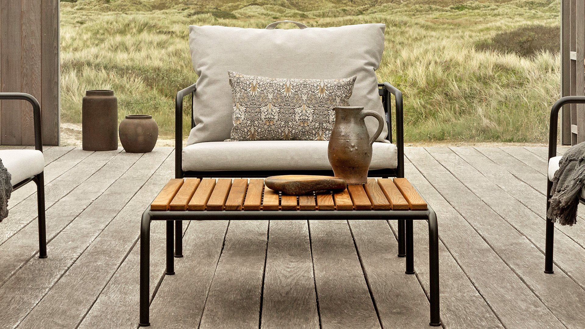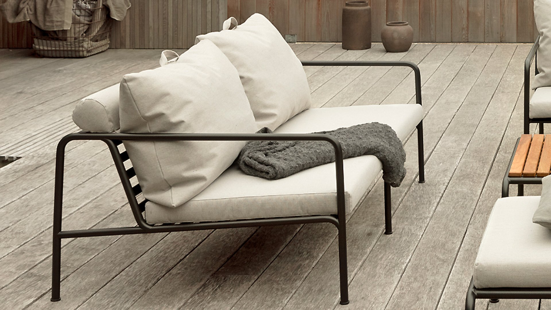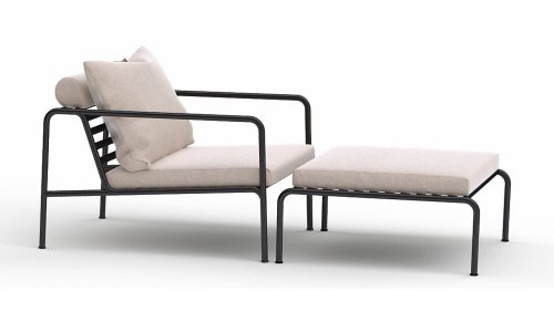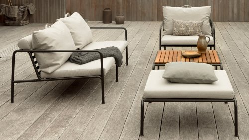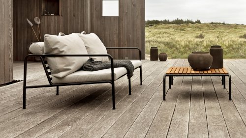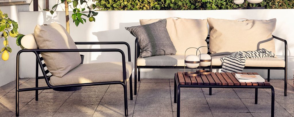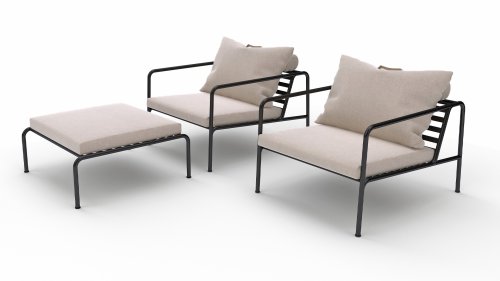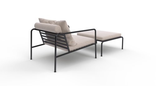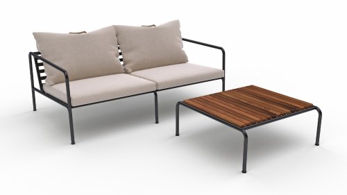 De AVON lounge collectie van Houe bestaat uit een 2-zits bank, een loungestoel en een poef met kussens in Sunbrella Heritage-stof en een loungetafel onderstel, welke kan met of zonder tafelblad in thermo essen worden gebruikt. De frames zijn gemaakt van gepoedercoat zwart staal.