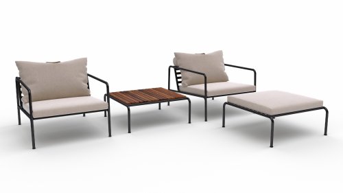 De AVON lounge collectie van Houe bestaat uit een 2-zits bank, een loungestoel en een poef met kussens in Sunbrella Heritage-stof en een loungetafel onderstel, welke kan met of zonder tafelblad in thermo essen worden gebruikt. De frames zijn gemaakt van gepoedercoat zwart staal.