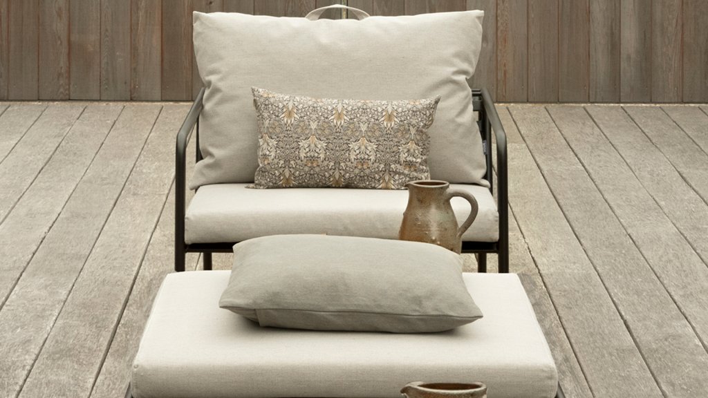 De Alpine groene en de Ash licht grijs/ecru kleurige kussens zijn gemaakt met Sunbrella Heritage-stof die 50% gerecycled acryl bevat. Kleurrijke vezeleinden van het proces van hergebruik van het primaire materiaal kunnen in het weefsel verschijnen en de stofkleur doen variëren van de ene batch tot de andere. Hierdoor ontstaat een unieke stof met een natuurlijke uitstraling en vintage charme. De stof is Oeko-tex gecertificeerd, waterafstotend, vlekbestendig en onderhoudsvriendelijk.