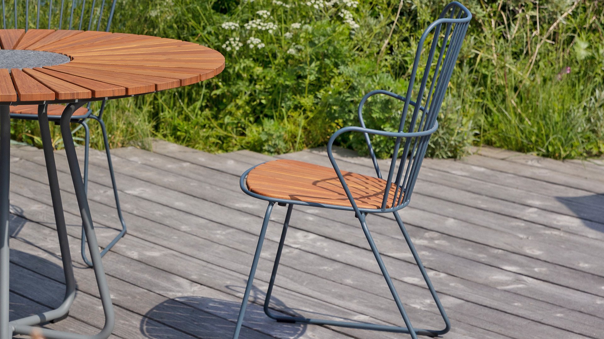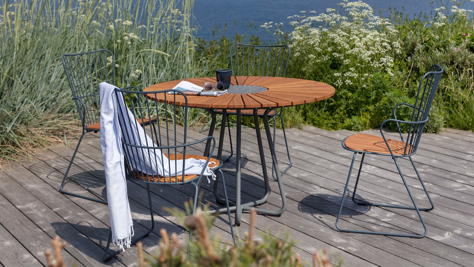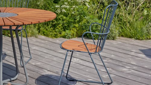 De HOUE PAON is licht Scandinavisch in zijn ontwerp maar met een vleugje Franse Victoriaanse romantiek. De HOUE PAON-lijn bestaat uit eetkamerstoelen, fauteuil, schommelstoel, een tweezitsbank en een barstoel. Gemaakt van gepoedercoat staal in combinatie met prachtige bamboe lamellen.