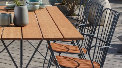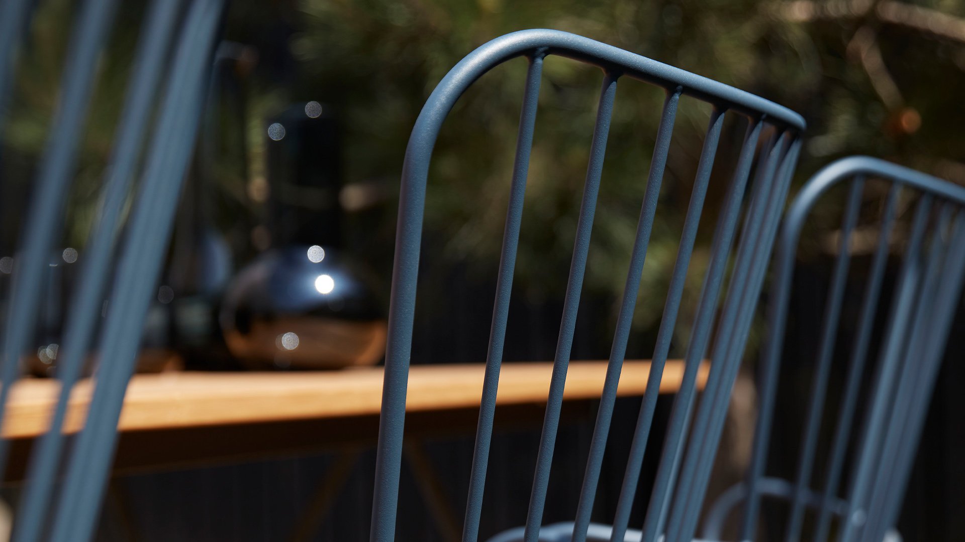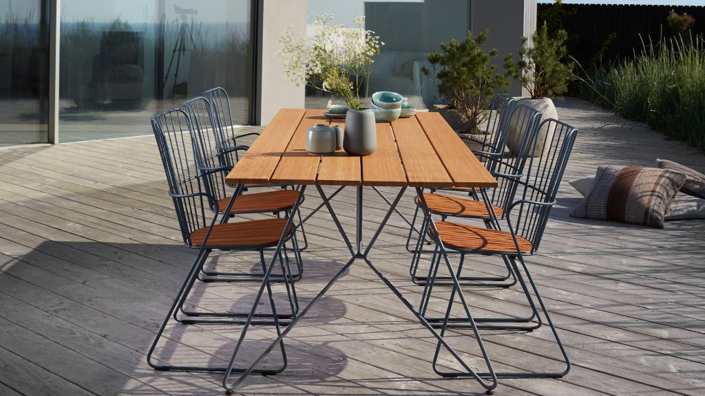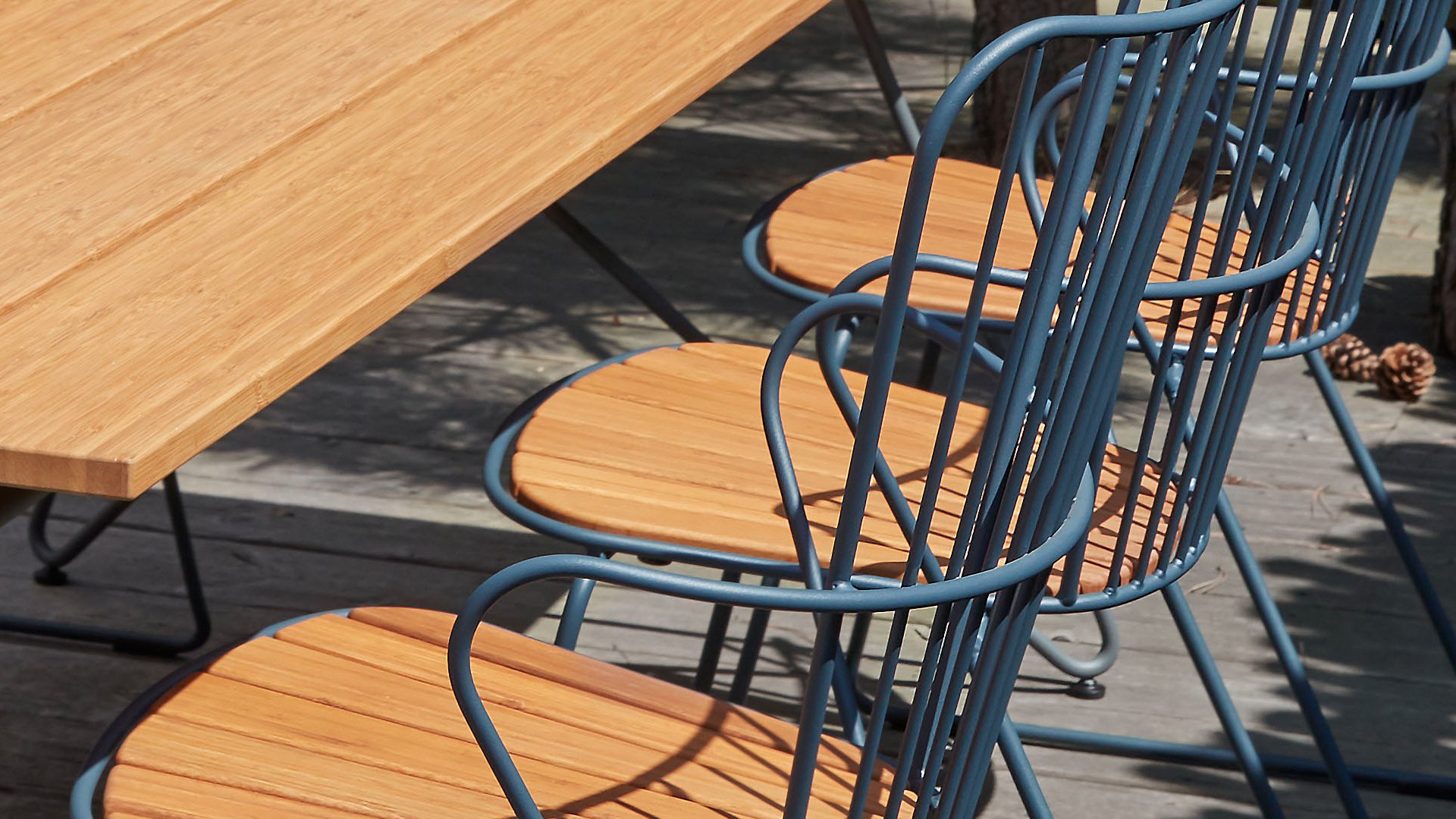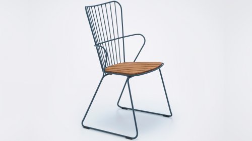 De HOUE PAON is licht Scandinavisch in zijn ontwerp maar met een vleugje Franse Victoriaanse romantiek. De HOUE PAON-lijn bestaat uit eetkamerstoelen, fauteuil, schommelstoel, een tweezitsbank en een barstoel. Gemaakt van gepoedercoat staal in combinatie met prachtige bamboe lamellen.