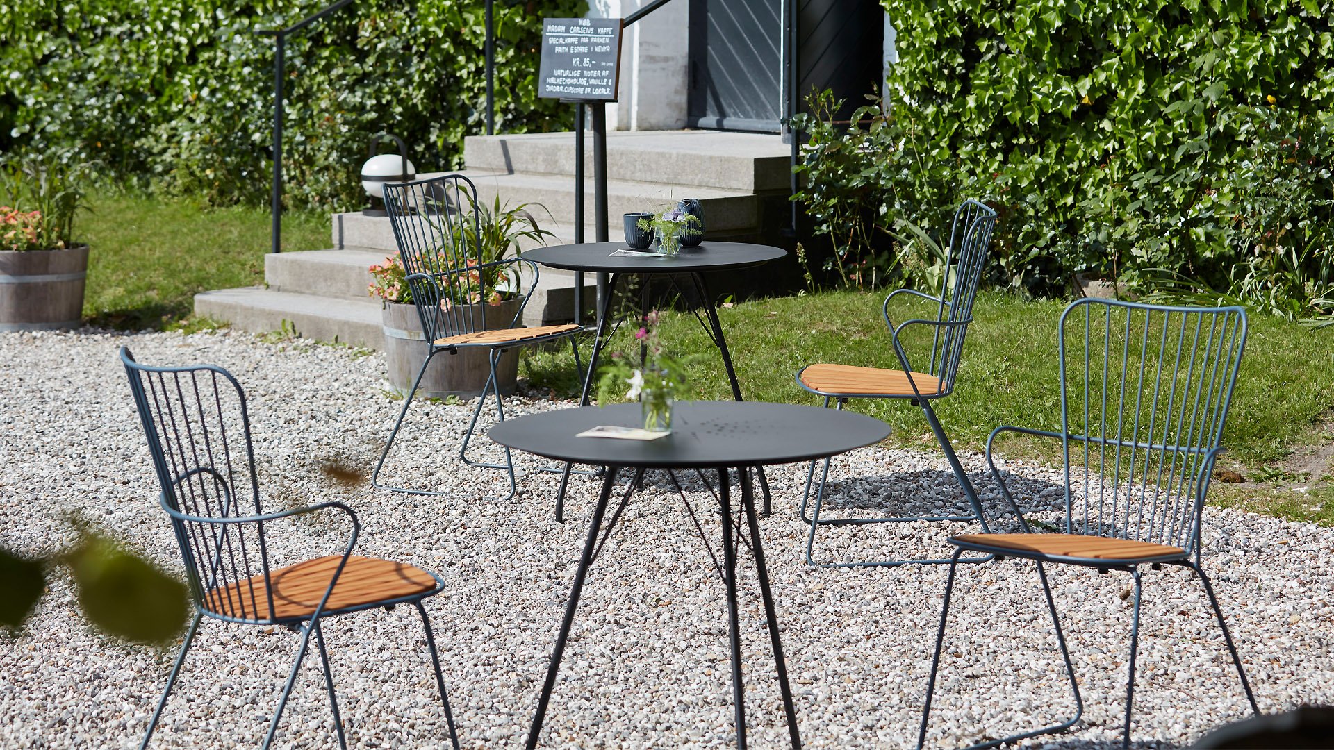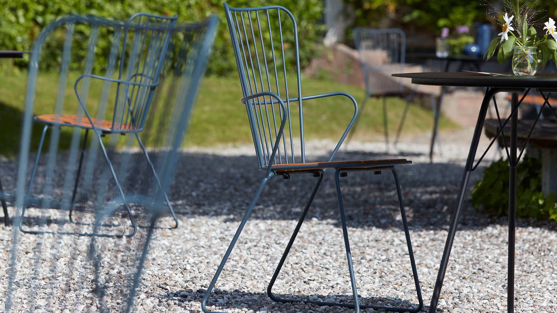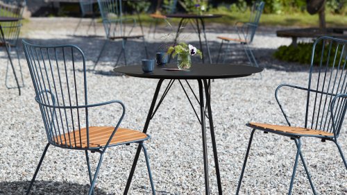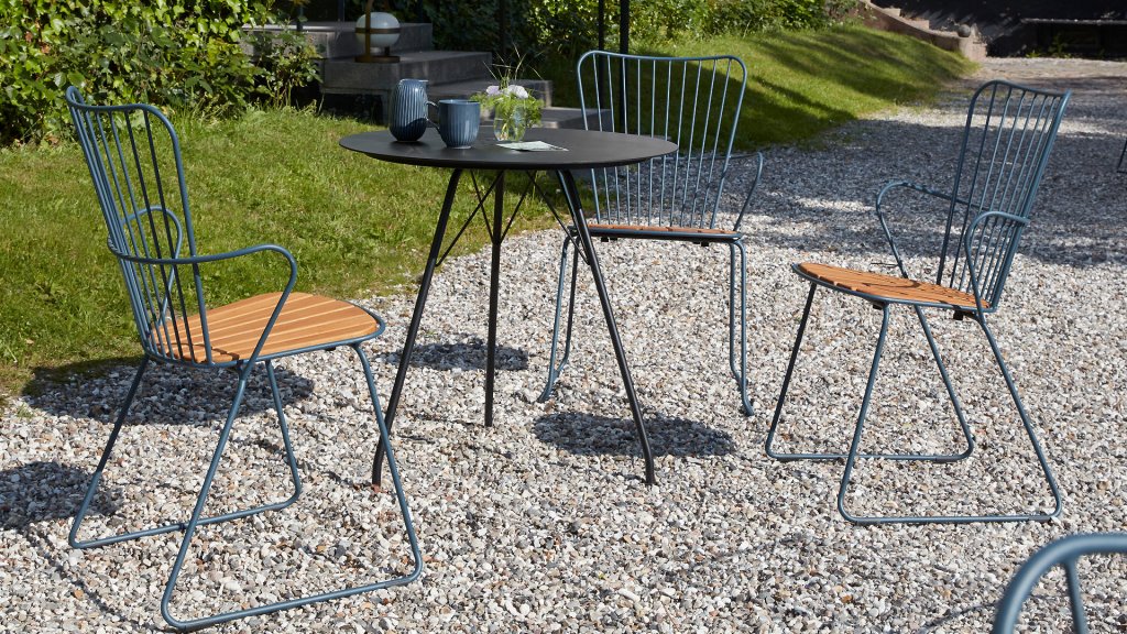 De HOUE PAON is licht Scandinavisch in zijn ontwerp maar met een vleugje Franse Victoriaanse romantiek. De HOUE PAON-lijn bestaat uit eetkamerstoelen, fauteuil, schommelstoel, een tweezitsbank en een barstoel. Gemaakt van gepoedercoat staal in combinatie met prachtige bamboe lamellen.