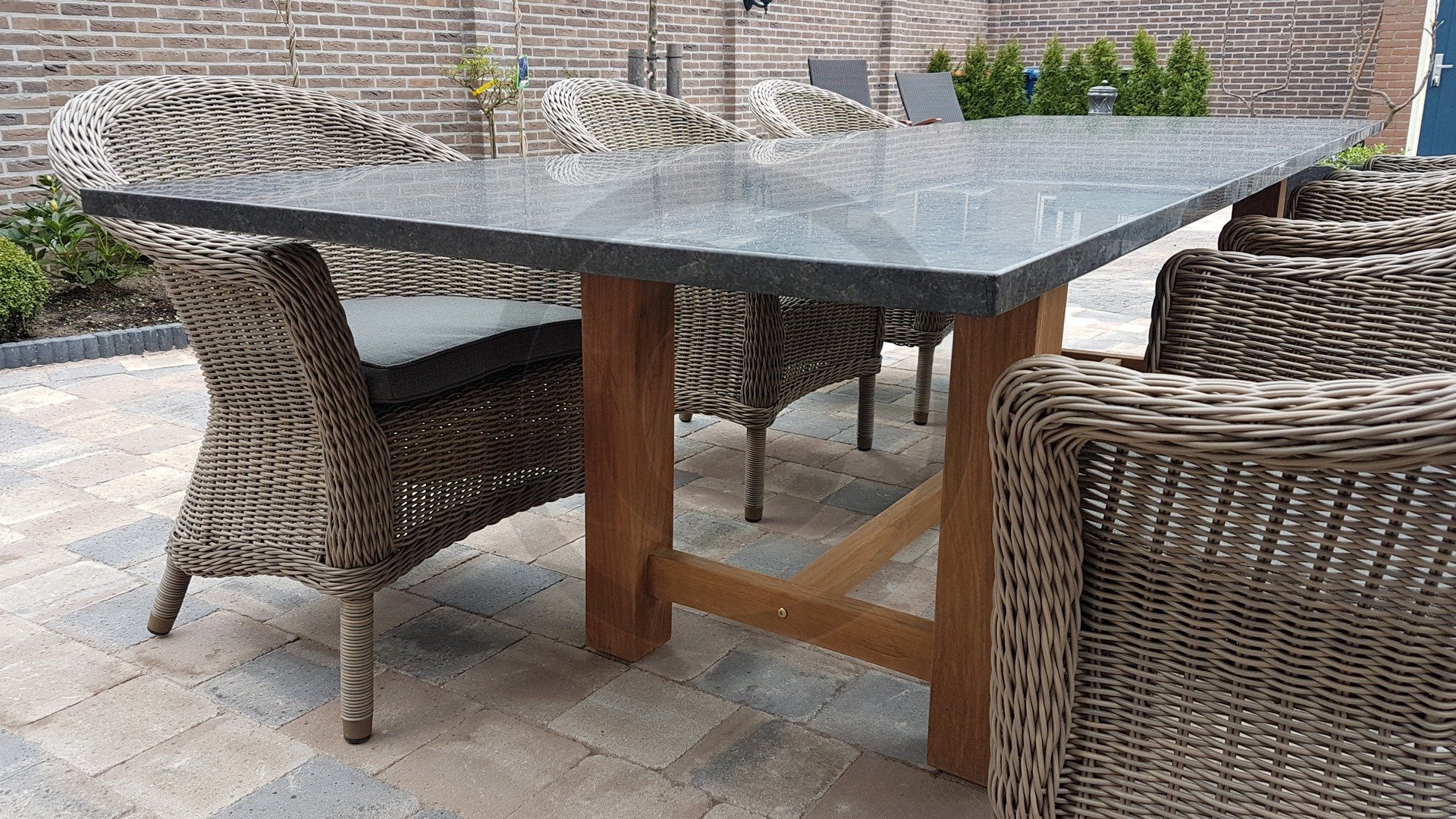 Teakhouten tuinmeubelen zorgen voor een prachtige uitstraling. Bovendien is het sterk materiaal en vraagt het weinig onderhoud. Als u uw teakmeubelen buiten laat staan, krijgt het in de loop der jaren een ander uiterlijk. U kunt uw teakhouten tafels eventueel ook behandelen met olie of lak. Daarnaast kunt u teak met groene zeep reinigen.