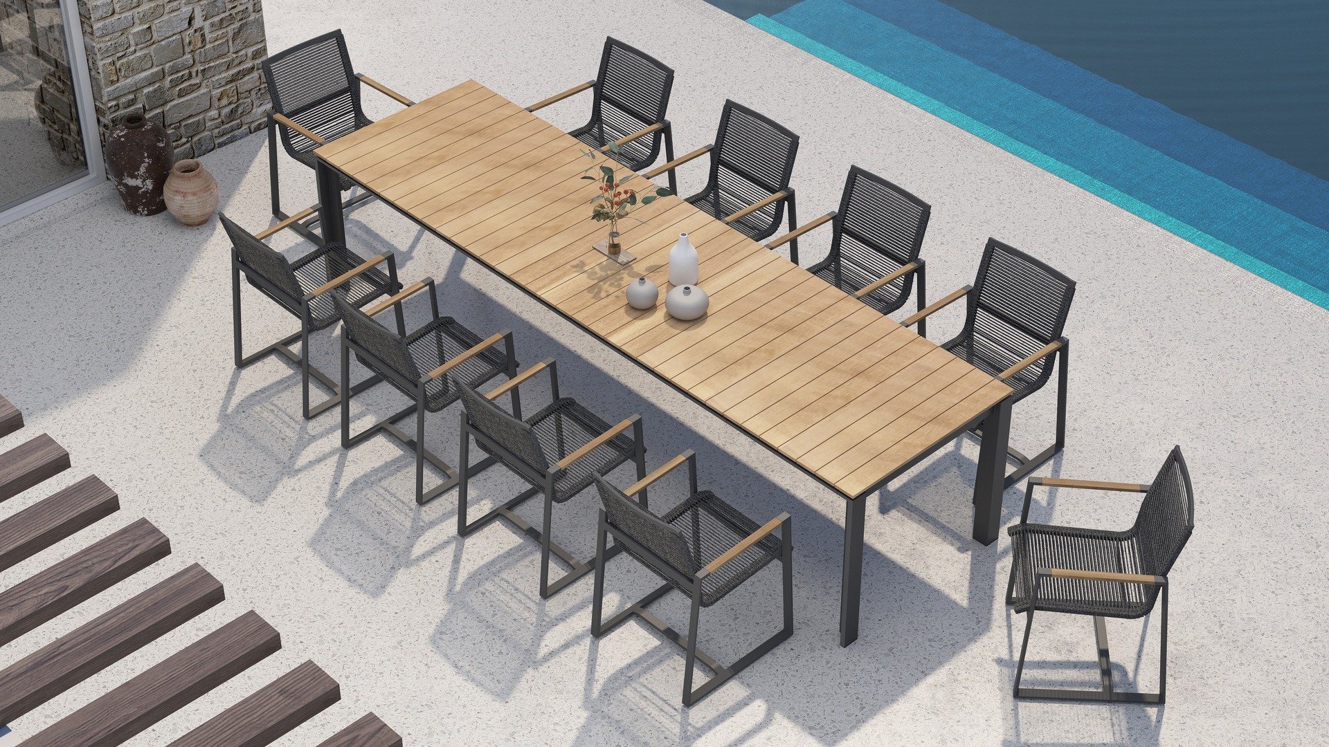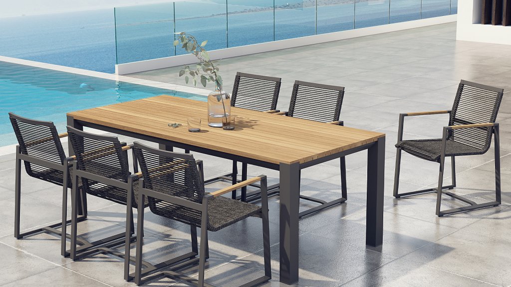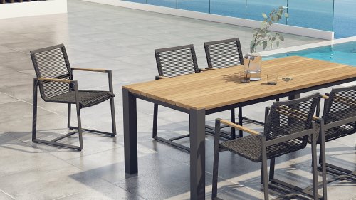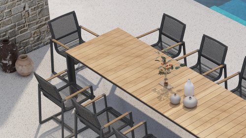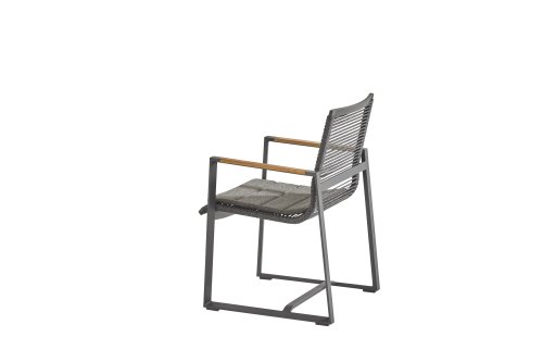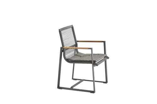 De Pandino stoel is een lust voor het oog. Het antraciet aluminium frame is stevig en modern. In de armleuningen is teak verwerkt, waardoor de armleuning niet heet wordt in de zon maar desondanks wel een warme uitstraling aan deze stoel geeft. Dit geeft tevens de Pandino stoel een luxueuze uitstraling. Hierdoor is deze stoel ook makkelijk te combineren met allerlei soorten tafels. Deze Pandino combineren met een tafel met teak tafelblad en antraciet frame vinden wij werkelijk prachtig!