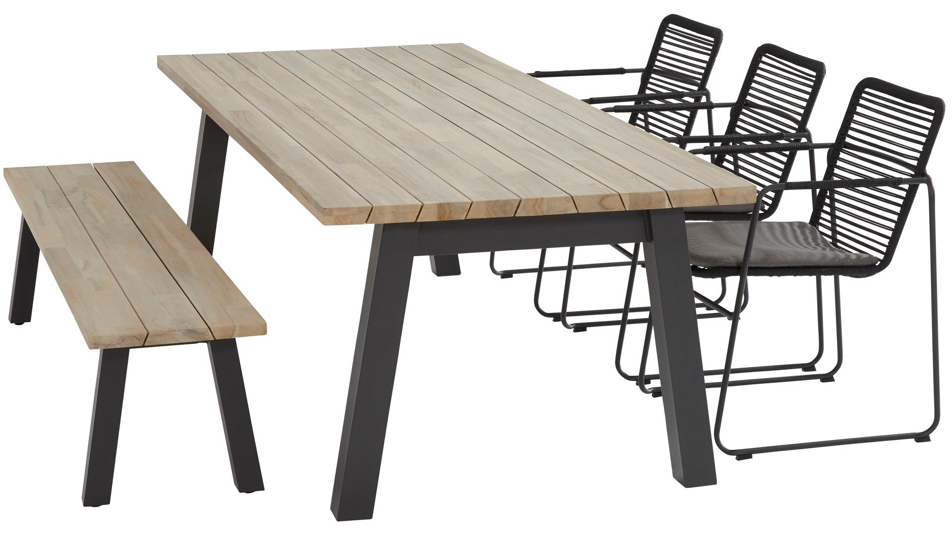 De sterke stof is bestand tegen een regenbui, uitritsbaar en wasbaar. Handig, maar let wel: de kussens zijn waterafstotend. Laat je ze lang in de regen liggen, dan kunnen ze alsnog nat worden aan de binnenkant.