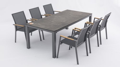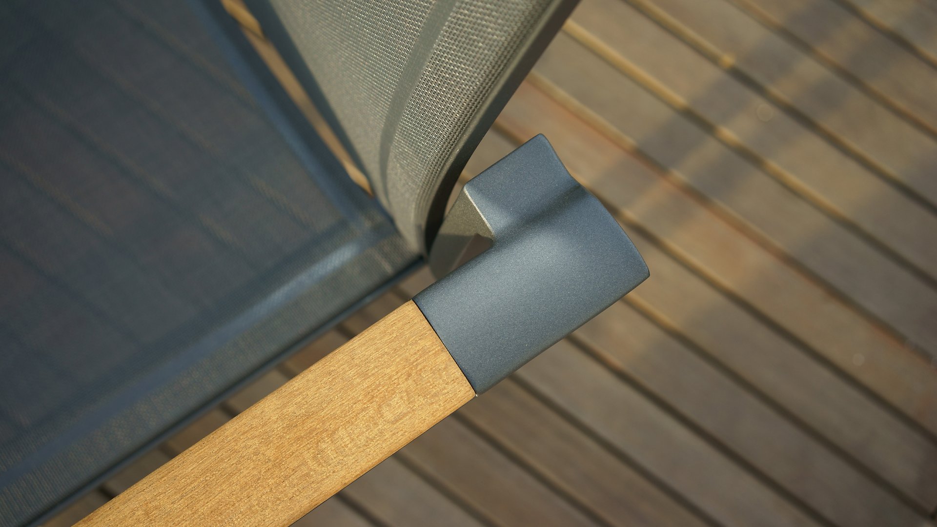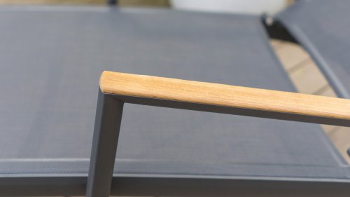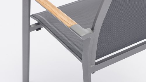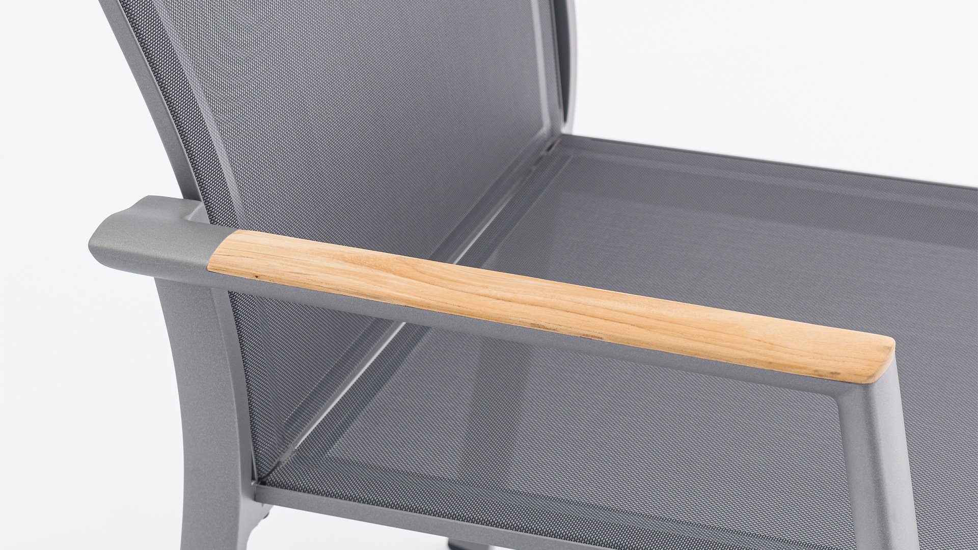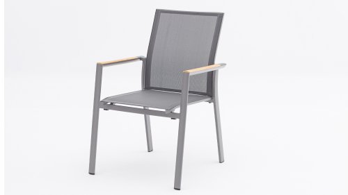 De Zebra Greenline Fly tuinstoel stapelbaar serie. Het frame van gepoedercoat aluminium Graphite, Palladium en de Fly RVS is bedekt met een Carbon Grey gekleurde Batyline® stof. De Fly stoel White heeft een Light Grey zitting. De Batyline® Textilene dat is gebruikt, is een bewezen synthetische stof die is ademend en scheurvast is voor meerdere jaren. De serie Greenline van Zebra combineert onder andere hedendaagse, ecologie en duurzaamheid met elkaar. In de corporate-concept Greenline is de kwestie van duurzaamheid en de selectie van milieuvriendelijke materialen, die worden verwerkt tot comfortabele, fraai vormgegeven, tijdloze meubels. De Zebra Fly tuinstoel is een prachtige comfortable stoel met teakhouten armleuningen. Deze armleuningen hebben een Natural Finish wat mooi "matcht" met de Hudson en Ocean tafel.