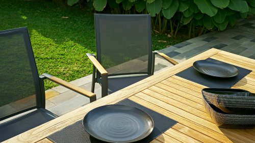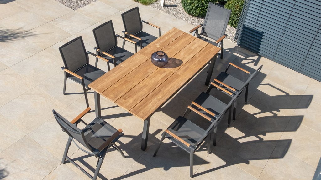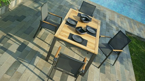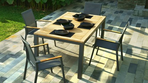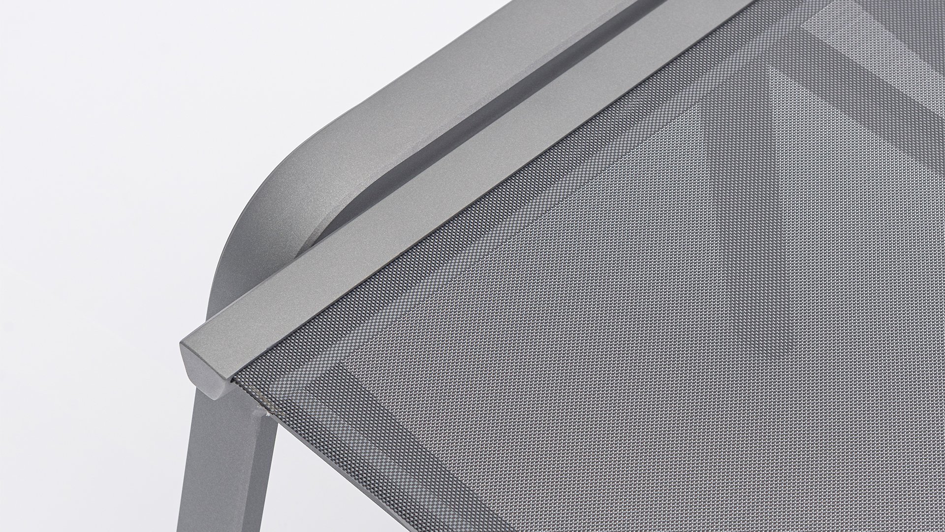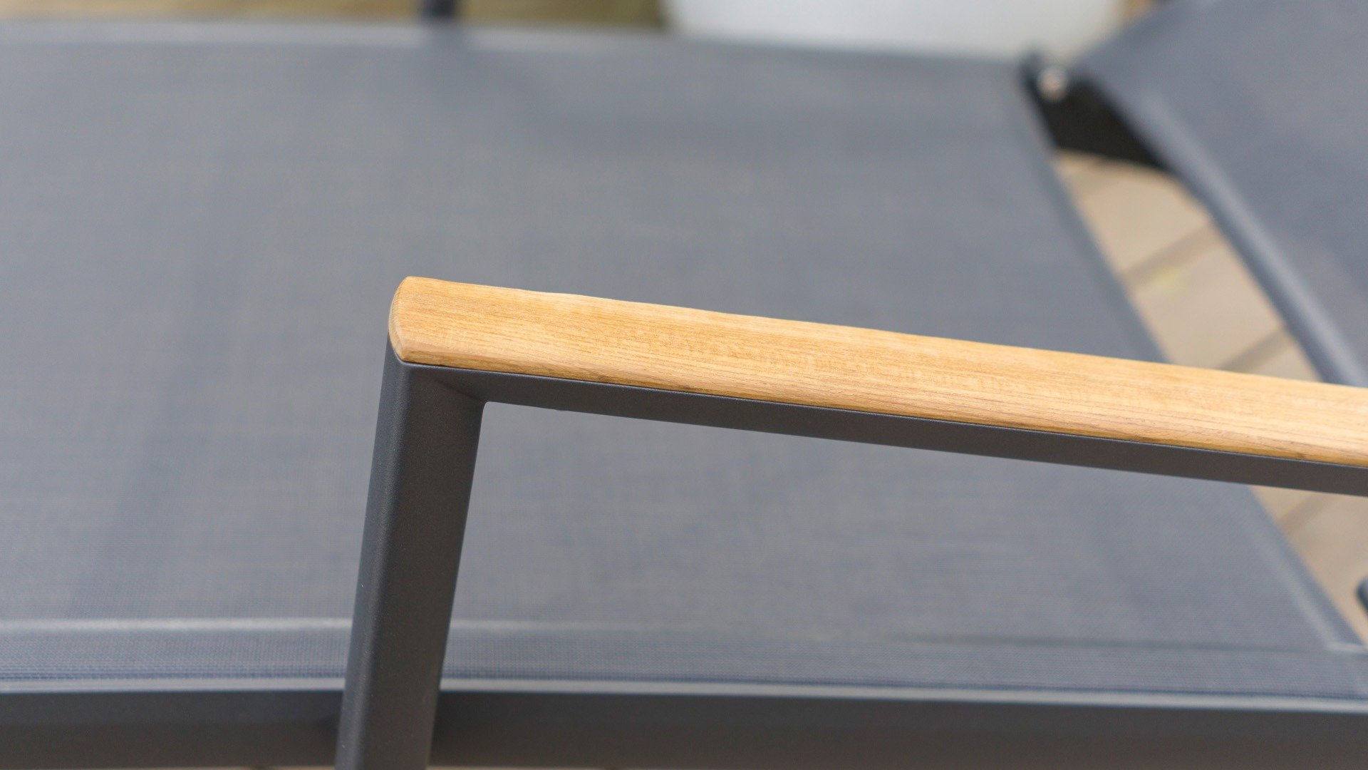 De Zebra Greenline Fly tuinstoel stapelbaar serie. Het frame van gepoedercoat aluminium Graphite, Palladium en de Fly RVS is bedekt met een Carbon Grey gekleurde Batyline® stof. De Fly stoel White heeft een Light Grey zitting. De Batyline® Textilene dat is gebruikt, is een bewezen synthetische stof die is ademend en scheurvast is voor meerdere jaren. De serie Greenline van Zebra combineert onder andere hedendaagse, ecologie en duurzaamheid met elkaar. In de corporate-concept Greenline is de kwestie van duurzaamheid en de selectie van milieuvriendelijke materialen, die worden verwerkt tot comfortabele, fraai vormgegeven, tijdloze meubels. De Zebra Fly tuinstoel is een prachtige comfortable stoel met teakhouten armleuningen. Deze armleuningen hebben een Natural Finish wat mooi "matcht" met de Hudson en Ocean tafel.