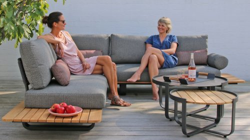 De Zebra Park Loungeset heeft een frame van gepoedercoat aluminium in de kleur grafiet. De knusse zit- en rugkussens zijn bekleed met mixgrijze Sunproof * Fontelina-stof en zijn niet alleen ongelooflijk onderhoudsvriendelijk, maar ook supercomfortabel. Het weerbestendige teakhouten blad steekt uit over het aluminium frame en is daardoor ook als tafeltje te gebruiken. De combinatie van aluminium frame en onderstel van teak harmonieert perfect.