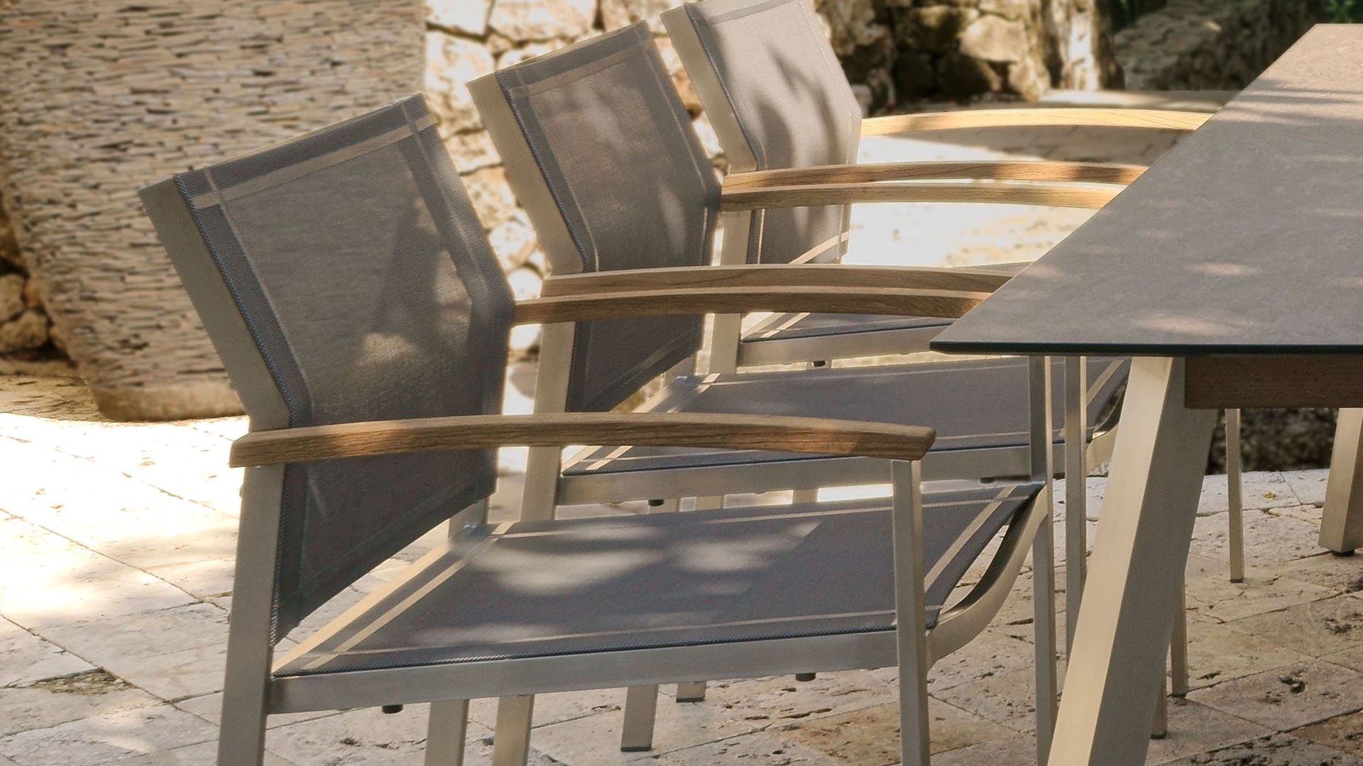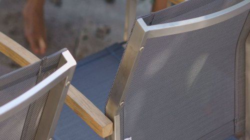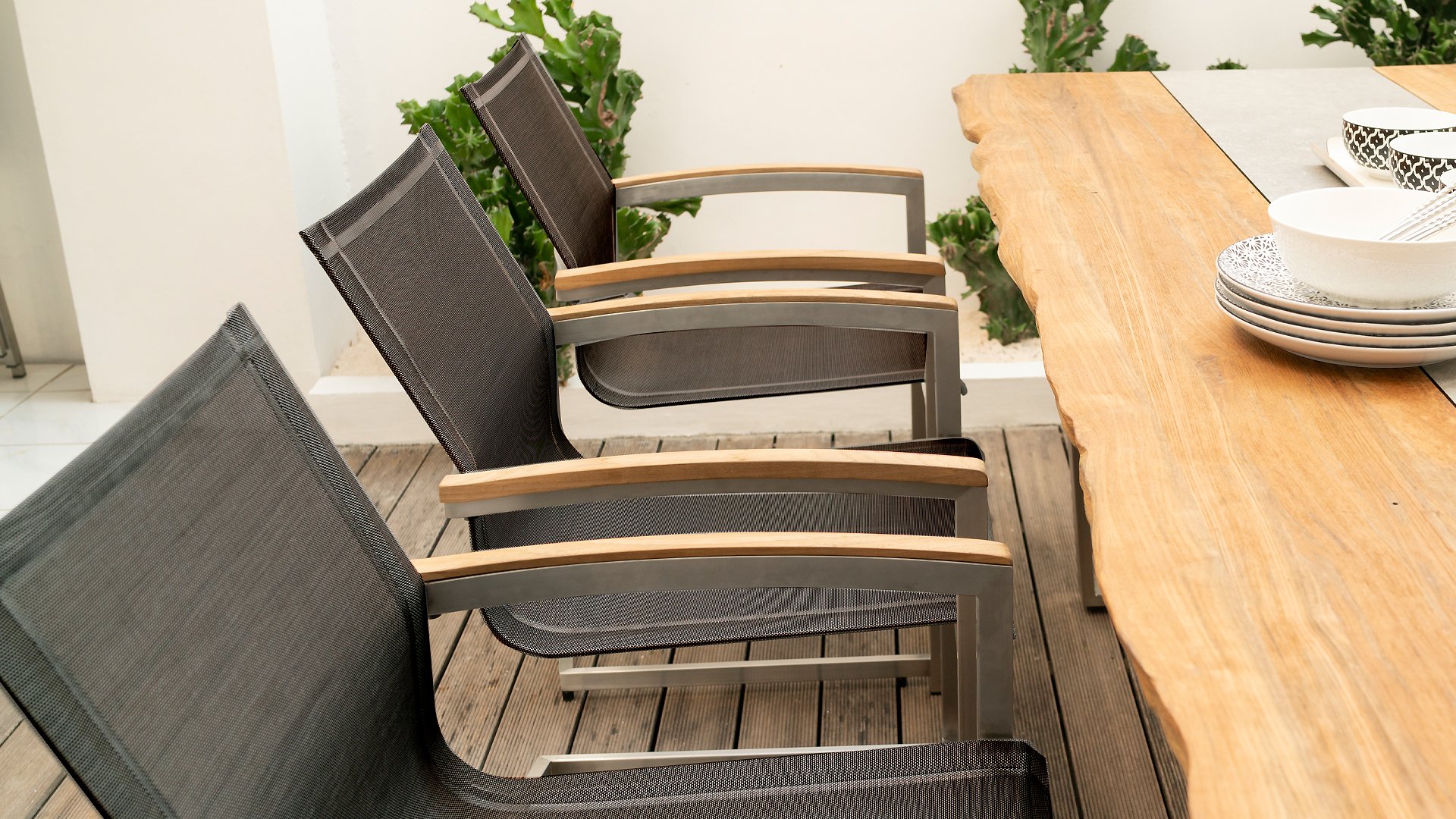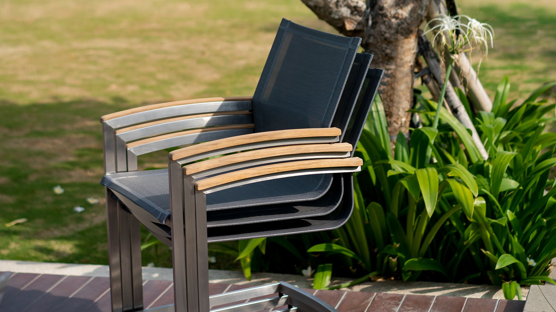 De Zebra Setax tuinstoel stapelbaar serie. Het frame van geborsteld roestvrij staal is bedekt met een antraciet gekleurd textilenen stof.