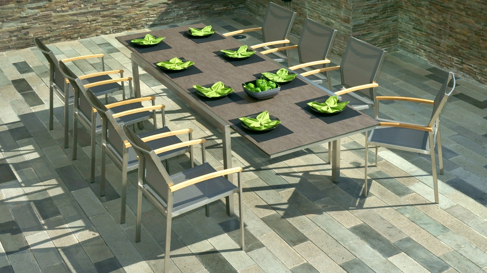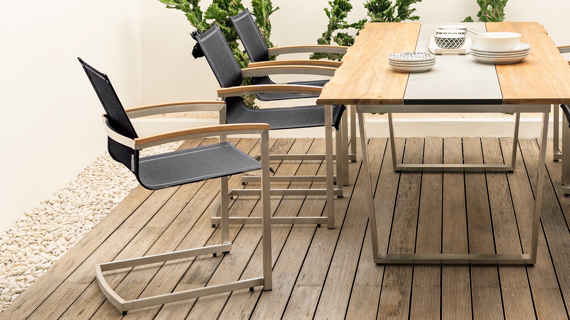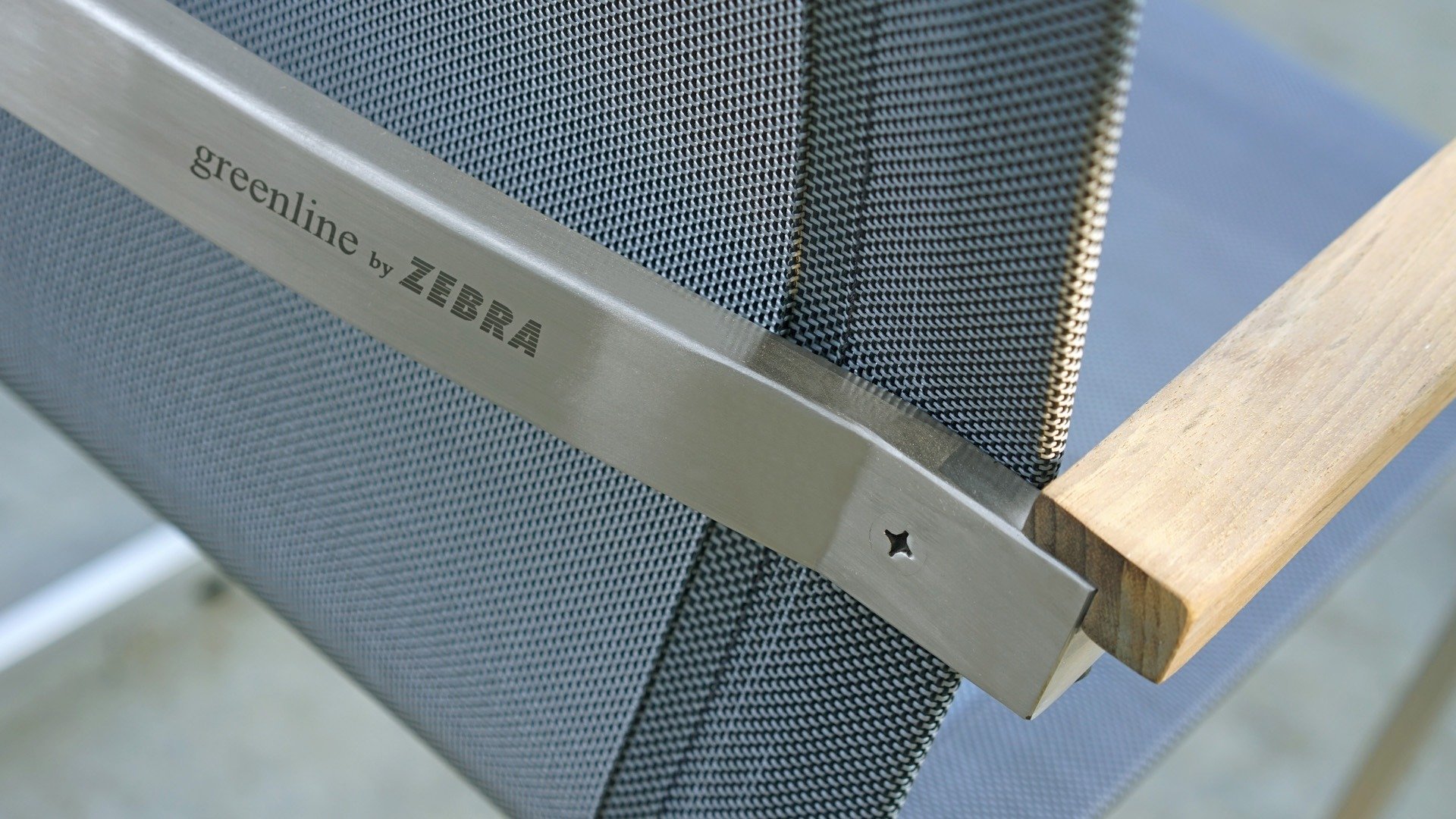 De Zebra Setax tuinstoel stapelbaar serie. Het frame van geborsteld roestvrij staal is bedekt met een antraciet gekleurd textilenen stof.
