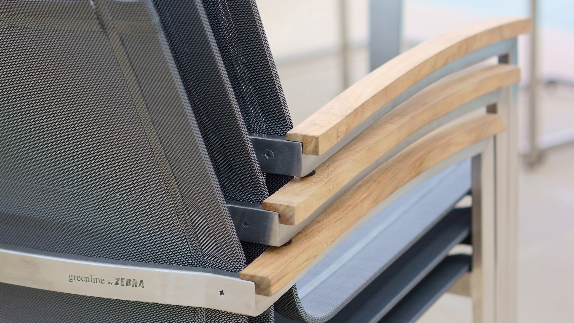 Deze RVS stapelstoel Setax van Zebra is niet alleen een ergonomisch geperfectioneerde stoel, maar overtuigt ook door het minimalistische ontwerp en fijne teakhouten armleggers.